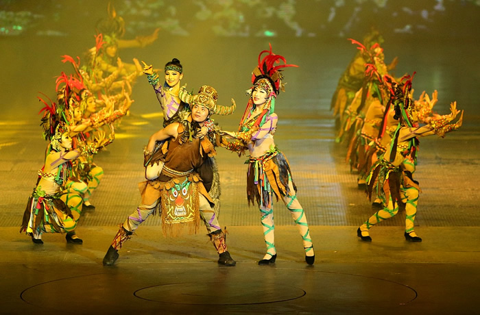 全剧综合了舞蹈、杂技、武打、舞台机械、全景特技、装置艺术等元素,通过高空反重力走月亮、大鹏神鸟救祖、高空撞门杠、水雷、洪水、瀑布、雨帘栈道、大型雪山机械模型等上万套高科技机械与原生态艺术相结合,勾勒出一部充满着灵与肉、血与泪、生与死、情与爱的文化传奇。